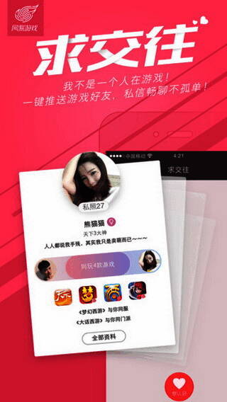 网易游戏App拥有强大的游戏大数据系统,自动识别游玩历史记录、地理位置、基本资料等信息为您推荐志同道合的游戏好友,匹配后可加对方为好友,私信密聊共同探索游戏世界;