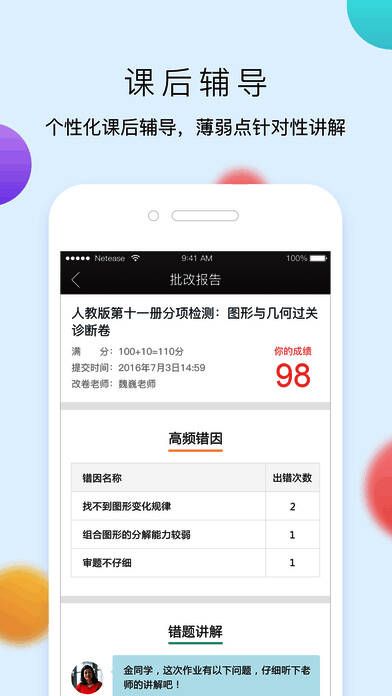 《网易100分》是一款专业的在线教辅软件。通过这款软件,中小学生可以享到各种名师的一对一教辅,帮助孩子更快的掌握学习要点,快速提分。还有各种纸质试题,帮助孩子更快的进步。