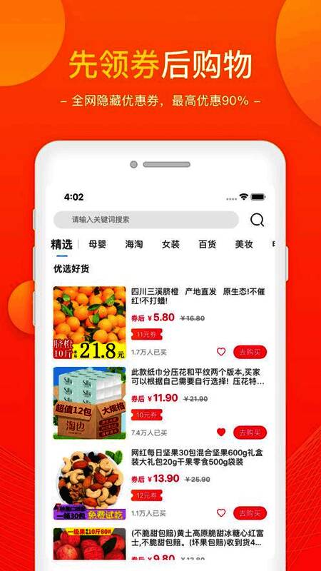 可以快速领取优惠券的《淘够花》是一款非常实用的手机购物软件。淘够花软件内,轻松搜索你想买的商品,海量的商品,分类齐全,不管是百货、日用、服装、美食等等,应有尽有!还有大额的优惠券等你来领取,各种优质商品等你优惠来购。
