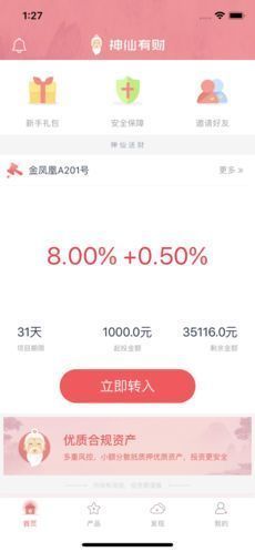 《神仙有财》第一款非常安全透明的掌上理财神器,在这款软件中你不仅能购买到丰富的高回报理财产品,还可以让你在这款软件中享受到极简的软件操作!感觉不错的话就赶快下载软件开始投资吧!
