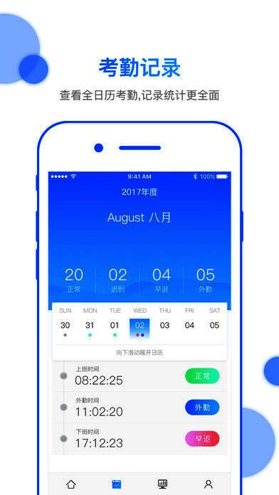 1、考勤日历:员工可以通过考勤日历查看之前的考勤记录;