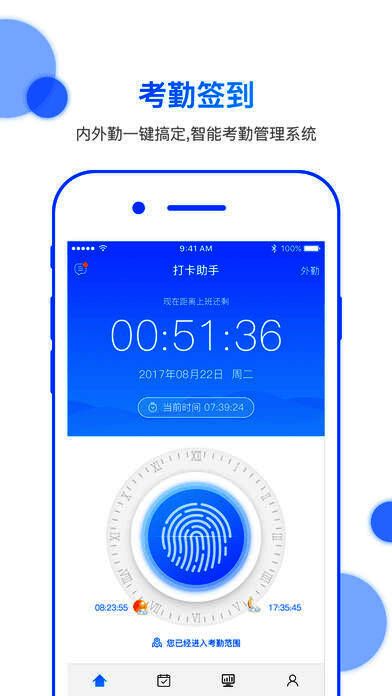 4、打卡签到:员工进入公司范围,可以通过软件进行签到,程序会自动识别上下班打卡,超出公司范围可以进行外勤打卡;