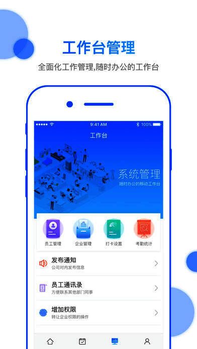 2、管理相关:工作台为企业管理员提供了员工管理,企业管理,打卡设置,考勤统计,员工通讯录,发布通知,权限管理等功能;