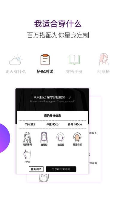 1、定制搭配、专业身形偏好测试,给你更个性化的穿衣建议;