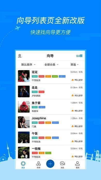 【UU客特色】不管你想去哪个学校玩,想观光哪个公司。无论你想去哪个城市看,想吃逛哪条街道。不论你是想旅游看景点,还是想约人约车逛周边。这些都不重要,重要的是,不管你在哪,无论你想玩啥。打开UU客,都能找到人陪你玩。