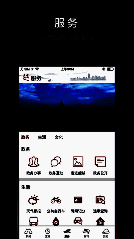 2、便捷生活服务支持天气查看、公共自行车的使用、驾驶违章的查询。