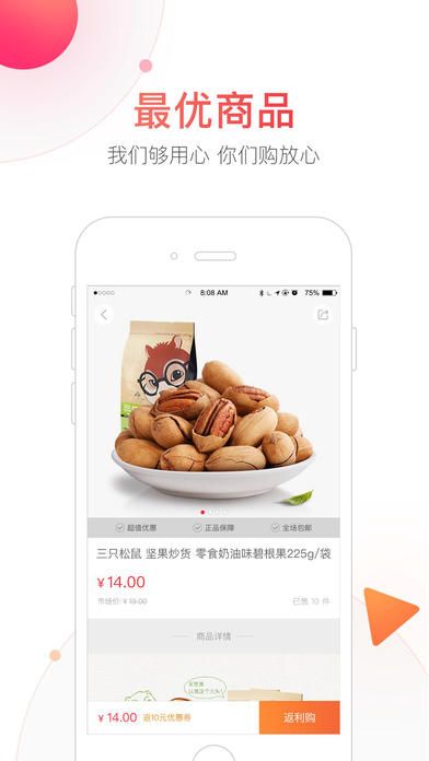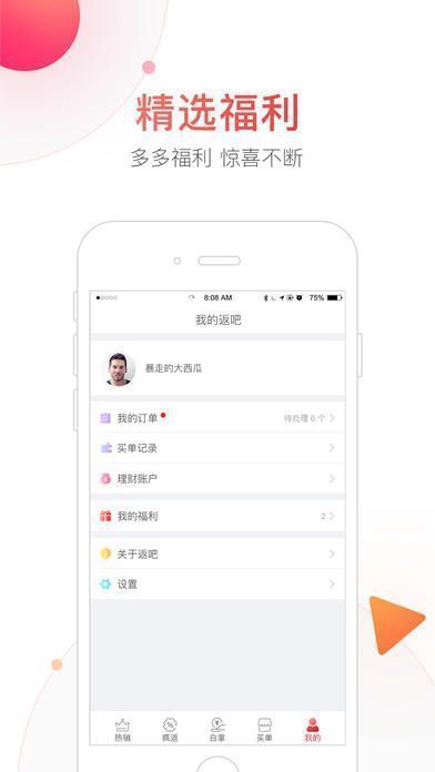 《返吧生活》是一款超热门的电商购物平台,软件为用户体验了海量优质商品,正品低价,白菜价买到优质商品,还为用户精选福利,惊喜不断,就等你来,喜欢的用户赶紧下载体验购物的乐趣吧!