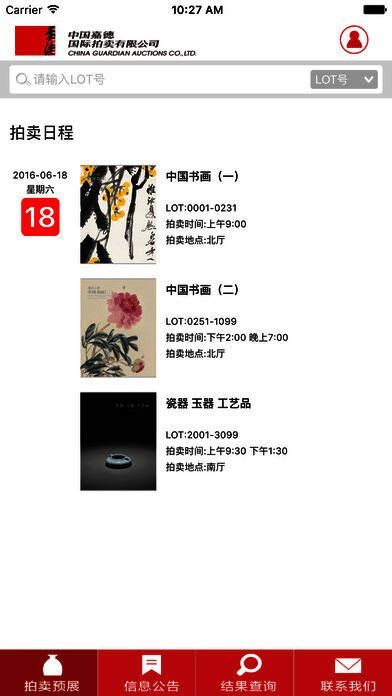 1、拍卖预展:展示正在预展中的拍卖时间地点、拍品图片信息;