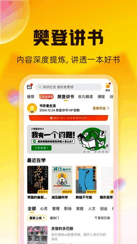 樊登读书汇聚了从经典文学到畅销新作的海量资源,涵盖自我成长、商业管理、心理社科等多个领域。无论你是职场新人还是资深读者,都能在这里找到契合兴趣的优质内容。