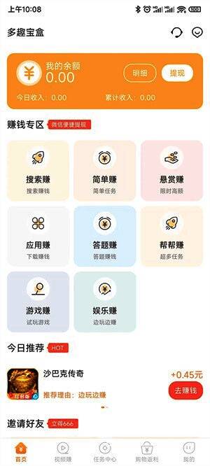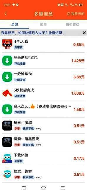 多趣宝盒app的核心在于其类型繁多的任务设置,包括悬赏任务、答题挑战、游戏试玩以及娱乐内容观看等。每种任务都有不同的难度等级和完成时长,用户可以根据自身情况自由选择。例如,喜欢动脑的人可以选择答题类任务,而热衷于尝试新游戏的用户则可以参与游戏试玩任务,边玩边赚。