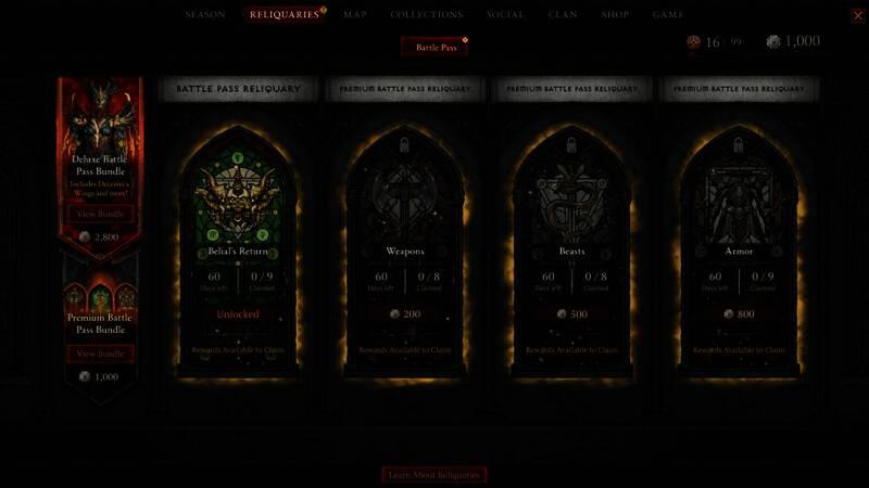 官方表示,新的圣物箱系统包含战斗通行证和活动圣物箱,其中,战斗通行证包含4个独立的圣物箱,玩家可以从这些圣物箱获得奖励。下一个赛季「彼列归来」会提供4种战斗通行证圣物箱选项:彼列归来、武器、野兽、防具。「彼列归来」是非特级战斗通行证的圣物箱,无须白金币即可获得奖励。其中甚至可解锁数百枚白金币。武器、野兽、防具为特级圣物箱,分别可用200/500/800枚白金币购买,或以1000枚白金币购买战斗通行证组合包时一并获得。