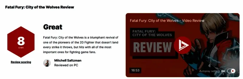 《饿狼传说:群狼之城》是SNK推出的一款备受期待的格斗游戏。游戏配置独特“美术风格”和“REV 系统”,提升战斗体验,还引入现代都市元素与开放世界探索机制,为玩家带来全新的格斗盛宴。目前,该游戏媒体评分已经正式解禁,其中知名外媒IGN为本作给出了8分的好评,媒体Gamingbolt 给出了7分的评价。