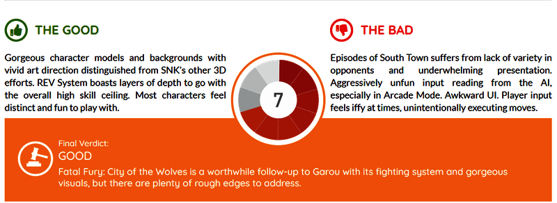 然而围绕这个坚实核心的诸多外围系统却显得滞后于时代:从极其基础的教学指引,到令人烦躁的丑陋菜单UI,无不显露着这个沉睡25年的系列亟待拂去的时代尘埃。但即便如此,这场暌违四分之一个世纪的回归之作,最终仍为格斗游戏界交出了一份精彩的答卷。