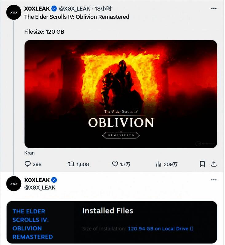 推主XOXLEAK泄露了《上古卷轴4:湮没 复刻版》PC Steam版的游戏容量:120GB。这个容量已经远远超过了原版游戏,后者游戏容量只有4.6GB,即便是后来的《上古卷轴5:周年纪念版》,PC Steam版也只有12GB。