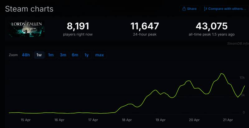 由于这次大更新,《堕落之主》这款已经发售一年多的类魂动作游戏焕发了第二春,24小时在线峰值超过万人,是更新之前(只有554人)的21倍还多。