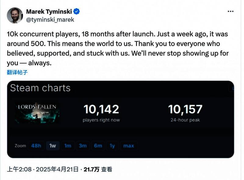 开发商CI Games的CEO Marek Tyminski也注意到了这一趋势,在X上发推庆祝玩家回流,感谢粉丝对这款游戏的坚持,即便已经发售18个月了,称这一切对他自己以及整个团队来说都太重要。