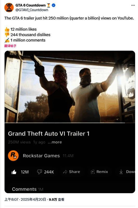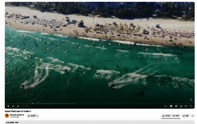 不仅如此,《GTA6》的预告片还吸引了1200万个点赞,超过100万条评价。