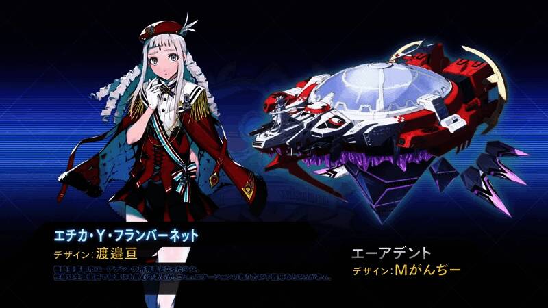 另外还公开了本作的母舰机动要塞都市「艾亚登特(エーアデント)」与舰长「艾奇卡‧Y‧弗兰巴奈特」。艾奇卡是艾亚登特的所有者,个性非常认真,对任何事情都充满热忱,但在与人沟通方面略显笨拙。