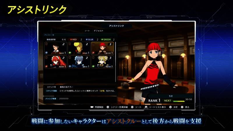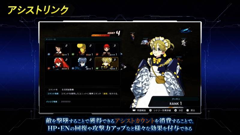 本作将导入名为「援助连结」的系统,可以让没有参加战斗的登场角色组成援助班底提供支援。战斗中可以使用击坠敌人所获得的「援助计数」来发动「援助指令」,提供上场机体恢復 HP、EN 或提升攻击力等各式各样的辅助效果。援助班底会根据通关任务以及使用援助指令的次数,在任务过关结算时获得相应的经验值,累积足够经验值就能提升级别,追加新的被动效果或是强化既有的效果。