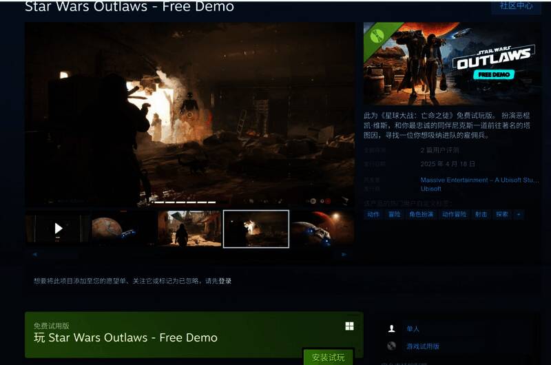 此外,育碧今天还上线了《星球大战:法外狂徒》的免费试玩。试玩版提供“长达三小时的游戏时间”,但玩家无法继承存档。