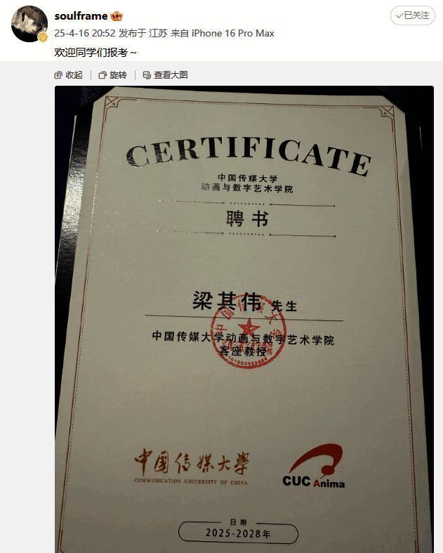 近日《影之刃零》制作人梁其伟在微博上发文,称已受聘为中国传媒大学动画与数字艺术学院客座教授,并展示了相关聘书。