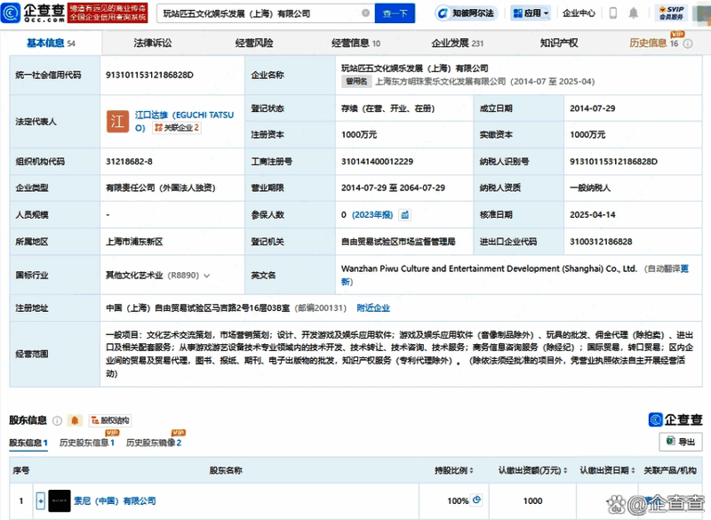 日前据企查查APP显示,原合资公司上海东方明珠索乐文化发展有限公司发生工商变更,公司更名为玩站匹五文化娱乐发展(上海)有限公司,原股东上海东方明珠文化发展有限公司退出,现由索尼(中国)有限公司全资持股。