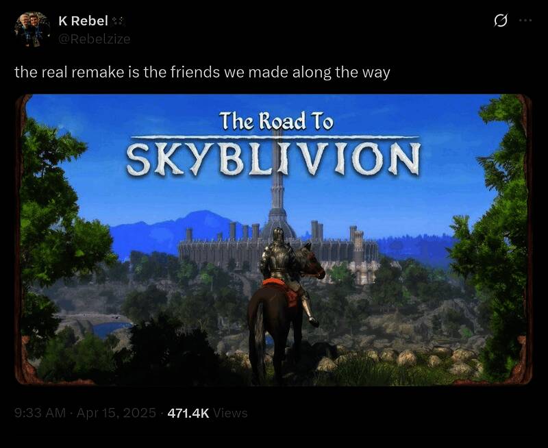 大型Mod“Skyblivion”已接近完成。该Mod采用《上古卷轴5》引擎重现整个湮没世界。近日Rebelzize发推文称,官方重制版的发布不会改变任何事情。他重申自家Mod本就出于热情驱动,团队将持续推进开发。