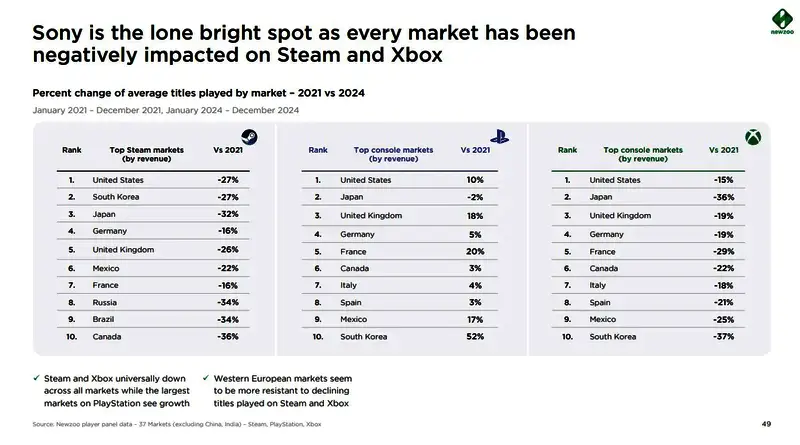PlayStation在全球游玩游戏的数量上有所增长,其中韩国(+52%)、法国(+20%)和英国(+18%)的增长最为显著。相反,Xbox和Steam在全球范围内下滑,其中日本和韩国在两个平台上的跌幅最大。这意味着全球有更多玩家更喜欢在PS这个平台上游玩游戏。