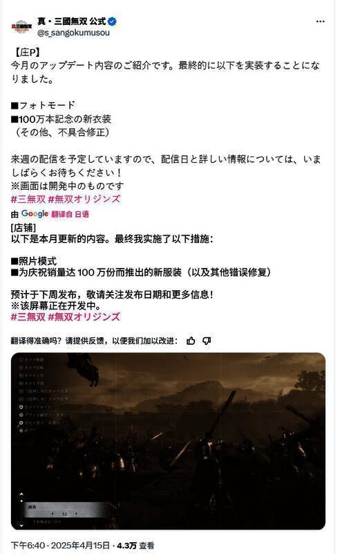 《真三国无双》官推宣布《真三国无双:起源》将在本月更新“拍照模式”和“纪念100万套销量的新服装”,预计将在下周上线。
