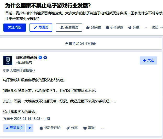 近日有人在知乎上提问:“为什么国家不禁止电子游戏行业发展”,Epic游戏商城官方给出回应,引起网友们的热议。