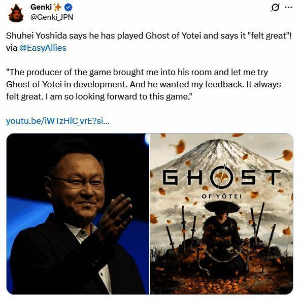 吉田修平称他拜访Sucker Punch Productions时,“游戏制作人把我带进他的房间,让我试玩了正在开发的《羊蹄山之魂》,并想听听我的反馈意见。这款游戏的体验太棒了。我非常期待这款游戏。”