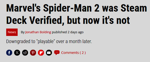 索尼互娱旗下《漫威蜘蛛侠2》于今年1月登陆PC(Steam)平台,,当时官方给出的Steam Deck的游玩兼容性指标为确定可玩,不过日前有玩家发现,这个游戏标定被悄悄换成了“游玩可能”,引发玩家关注,想要通过Steam Deck游玩本作的玩家需要注意了。