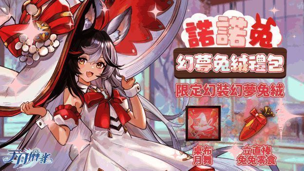 另外,诺诺兔的专属幻装「幻梦兔绒」及装饰物礼包,亦于版本更新后同步上架。化身成魔法少女的诺诺兔,将在麻将桌上施展她的「胡萝卜魔法」,配备专属立直棒「兔兔零食」及麻将桌桌布「月舞」,邀请客人大人一起跃进她的魔法世界。