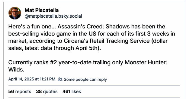 育碧旗下最新力作《刺客信条:影》在争议声中交出了一份亮眼的成绩单。Metacritic 82 分的评价和 Steam 平台的首发佳绩印证了其品质,现据 Circana 分析师 Mat Piscatella 提供的数据显示,该作自发售以来连续三周稳居美国游戏销量榜首,并迅速攀升至 2025 年全美销量第二位,仅次于卡普空的《怪物猎人:荒野》。