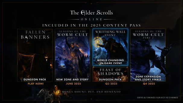 分为两部分的冒险“黑虫教之季”在2025年为玩家带来了全新的《上古卷轴OL》主要区域与故事线。被神秘的“翻腾之墙”分隔的至日岛正遭受围攻,来犯者则是恐怖的黑虫教。“黑虫教之季”故事延续了从《上古卷轴OL》基础版游戏开始的故事线(但你无需完成之前的剧情也同样可以体验此故事),这是《上古卷轴OL》史上首次出现的剧情发展方式。黑虫教之季(第1部分)将于6月2日登陆PC/Mac,6月18日登陆Xbox One、Xbox Series X|S与PlayStation 5主机端,第2部分则计划于2025年末上线。