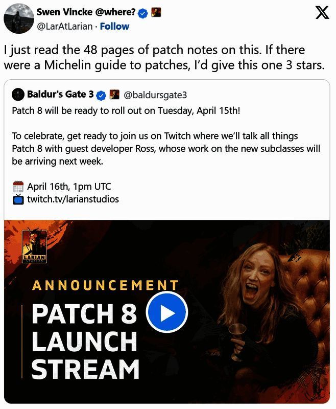 《博德之门3》将于4月15日迎来8号最终更新补丁。近日,瑞安工作室负责人斯温·文克在推特上发推透露道,本次补丁的内容丰富,长达48页,无法想象这次更新的规模有多么庞大!他表示:“刚刚阅读了这份长达 48 页的补丁说明,如果可以给它评分的话,他愿意给3星。”