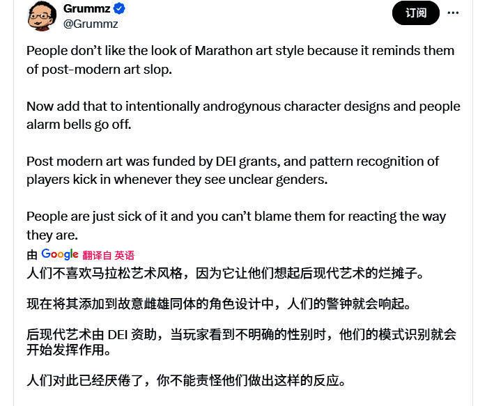 致力于反woke的推主Grummz显然坚守传统美学阵地,他批评Bungie《失落星船:马拉松》的角色设计故意模糊了性别界限。