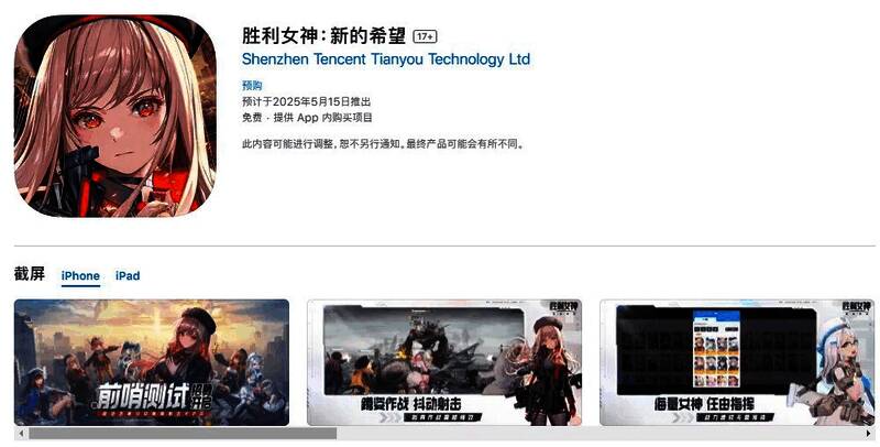 《胜利女神:新的希望》国服已获得版号,并在3月28日至4月7日期间开放了前哨测试。近日有网友发现,苹果商店页面显示《胜利女神:新的希望》将于5月15日推出。