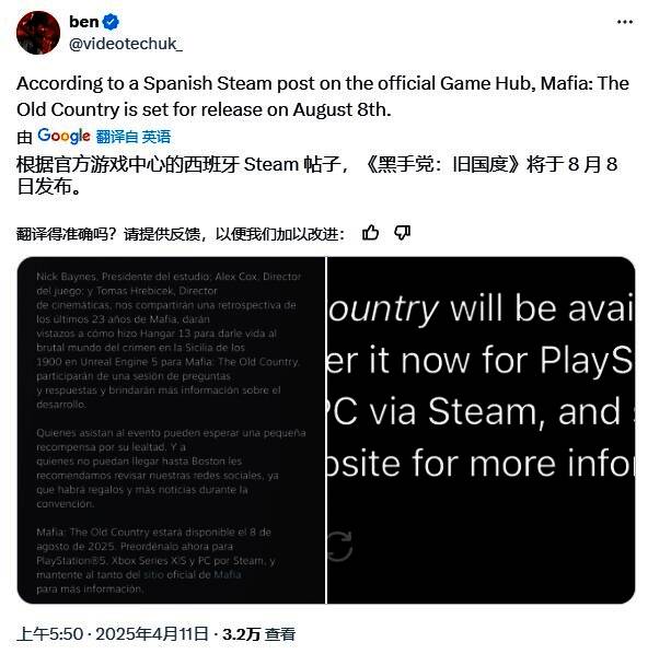 发行商2K似乎意外泄露了《四海兄弟:故乡》的发售日期——Steam新闻页面在宣传PAX East游戏展专题活动时透露,本作将于2025年8月8日登陆PS5平台。虽然相关文字已被删除,但推特用户@videotechuk_保留了原始截图。