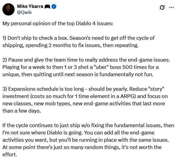 Ybarra认为《暗黑破坏神4》已迷失方向,他建议更新要暂停下重制开发节奏,让团队有时间真正解决终局内容的问题,其后期内容单薄、战利品没吸引力,Boss战变成极限玩家速刷的材料,在几天内就被清空。