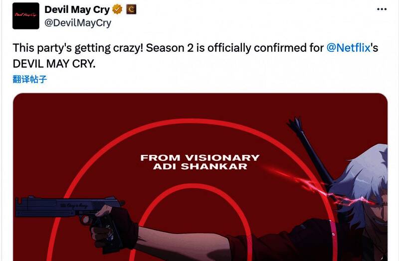 《鬼泣》官推宣布Netflix现已续订《鬼泣》动画剧集第二季。