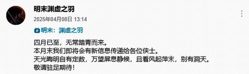 《明末:渊虚之羽》将于今年夏季发售,具体发售日未公布。今日(4月8日)《明末》官方在B站发文称,将在四月末公布新消息。