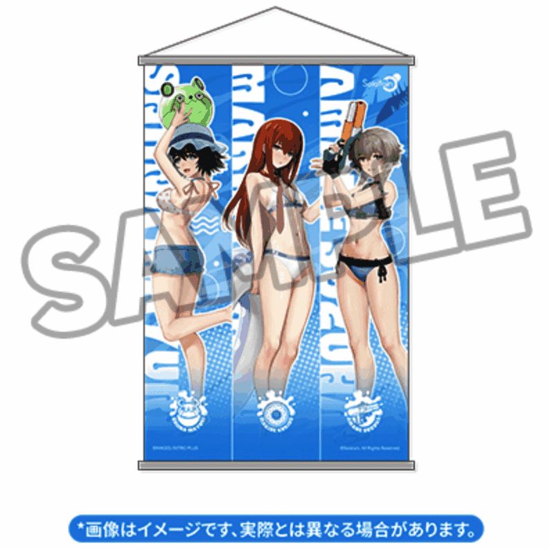 同时GSC有特别赠品提供,如果单独购买手办会附带牧濑红莉栖、椎名真由理、阿万音铃羽的收藏卡。如果有人购买整套收藏,还将获得一张 60cm x 40cm 的挂毯,上面是三位女主角穿泳装的视觉图。