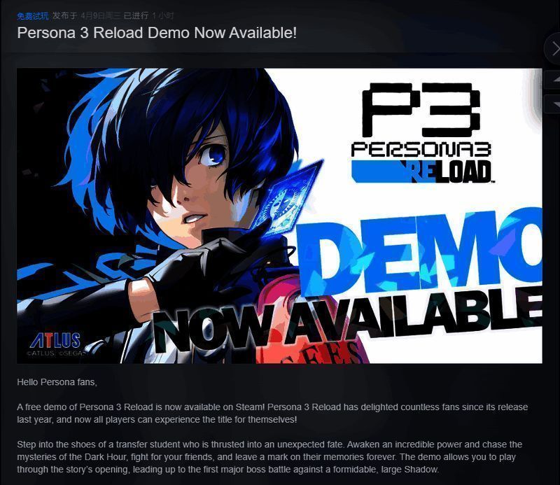 今天,发行商世嘉宣布《女神异闻录3 Reload》试玩版在PlayStation 5、PlayStation 4、Xbox Series、Xbox One以及PC(Steam)平台上线,试玩版游玩进度可以转移至购买的正式版。感兴趣的小伙伴可以点击下方链接跳转至Steam页面。
