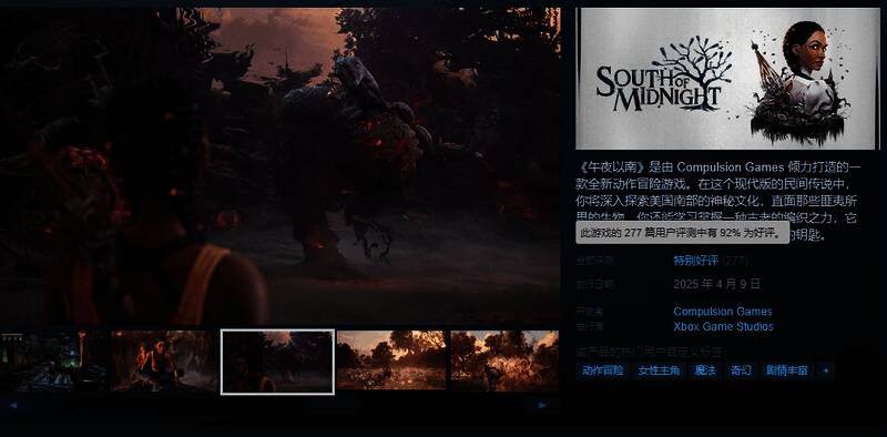动作冒险游戏《午夜以南》已在XSX|S和PC上发售,首发加入Game Pass。Steam国区标准版售价198元,豪华版售价248元。该作在Steam上总评为“特别好评”,好评率92%。有玩家表示,这游戏出乎意料的好玩!