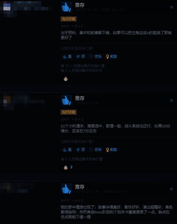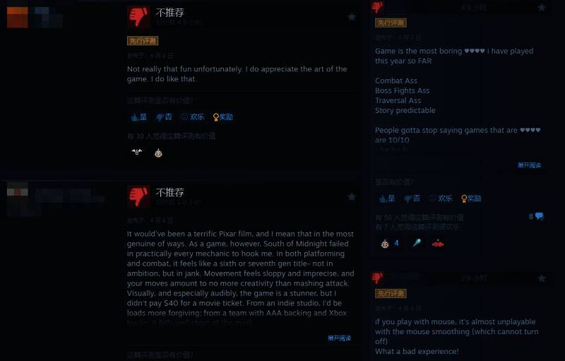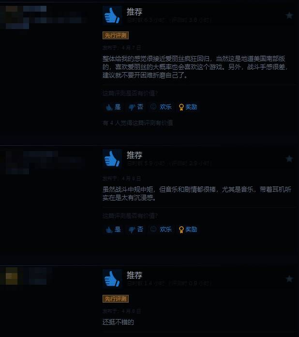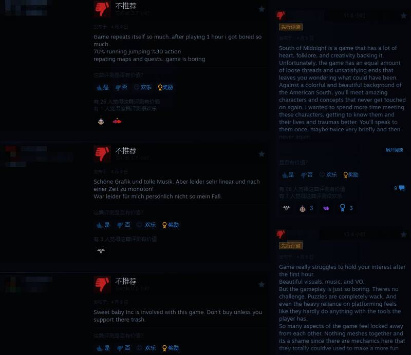给予好评的玩家认为,《午夜以南》出乎意料的好玩,如果把女主的脸换了就更好。人物表情动作和配音都很自然,美术很赞。虽然战斗中规中矩,但音乐和剧情都很棒!整体感觉很接近《爱丽丝:疯狂回归》。