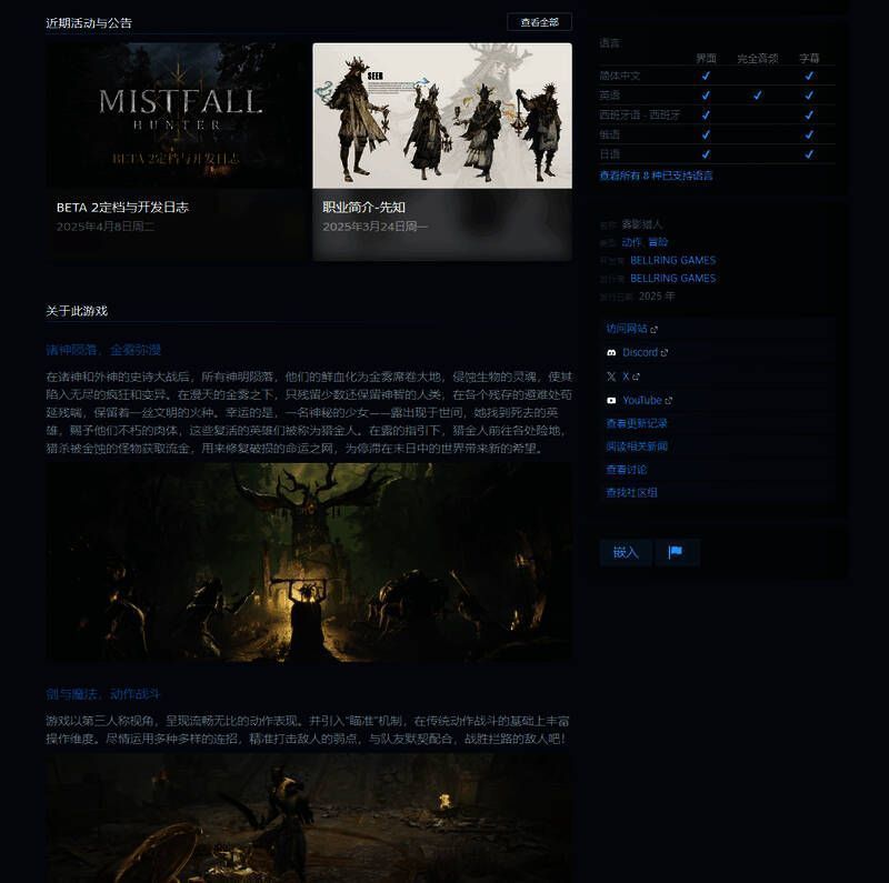 开发商Bellring Games宣布,第三人称动作PvPvE撤离RPG游戏《雾影猎人(Mistfall Hunter)》第二轮B测,将于北京时间2025年4月22日早上9点进行。