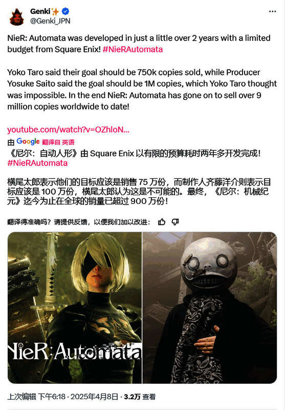 然而,《尼尔:机械纪元》的实际销量大大超乎了两人的预期。实际上,《尼尔:机械纪元》的销量现已超过了900万,是斋藤洋介预测的9倍。