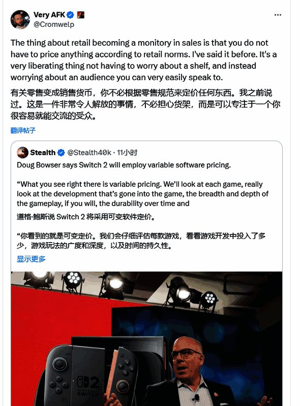 他在推特上对美国任天堂总裁最近说任天堂将对产品价格采用“可变定价”策略做出了回应:“关于零售价格成为销售主导因素的问题,关键在于开发者并不需要按照零售市场的常规标准来定价。我之前就说过:当你无需受限于定价,而是能专注于一个可以轻松对话的受众群体时,这种感觉是非常自由的。”