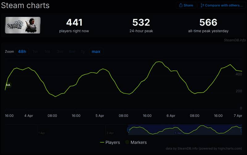 《午夜以南》典藏版已开放抢先体验,但玩家在线数表现一般。据SteamDB数据显示,当前在线玩家数为441人,24小时峰值为532人,历史最高峰值为566人。